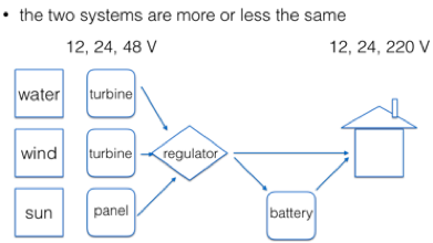 Back-up generators: there will be times when there is no water, no wind, and no sun, and the battery storage is inadequate. At those times, a generator will be necessary. It is important that the usual system for supplying the electricity (especially the inverter) is protected. If the generator is supplying 220 volts AC direct to the houses, the connection to the generator must be made so that that the inverter is isolated – eg, that current cannot flow backwards to the inverter. Most inverters cannot cope with a 220 volt input, and burn out. Inverters are expensive, and so an isolation switch is essential.