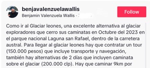 • Probablemente comprometiendo el status de la reserva de la biosfera: la puesta en escena de “influencers” no figura como herramienta de gestión en el Plan de gestión de la reserva de la biosfera de la UNESCO Laguna San Rafael.