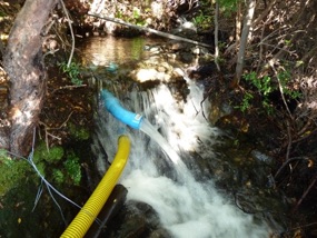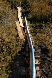 In our case, the very small streams from which we take water are approximately 150 metres higher and 1 km away. The water is initially filtered through a course mesh to remove leaves, seeds and other debris. The water from the bigger of streams is then passed through a tank where sediment settles. The pipe that brings the water approximately 850 metres to a small tank on the terrace above the house is 90 mm low pressure. A small secondary source, about 200 metres from the main source, is connected to the main line. A 75 mm high pressure pipe connects the small tank to the turbine. The vertical drop in the last 150 metres is about 65 metres. After passing through the turbine, the water is returned via low pressure pipe to the natural water system.