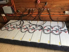 Estimating the size of the battery bank was difficult, and initially we underestimated the number of batteries with the consequence that there were periods when there was not enough energy, and we had to use the backup generator. We now have eighteen 12 volt 230 Amp-hr gel batteries configured as 24 volt.