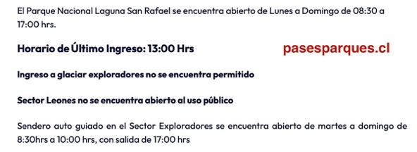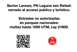 -Todos pasajes al sector Leones están vigilados 24 h. Toda la información sobre el paso no residencial, ya sea individual o con operadores o guías, esta transmitida a la administración del PNLSR, incluyendo matrículas de autos, motos y bicicletas.